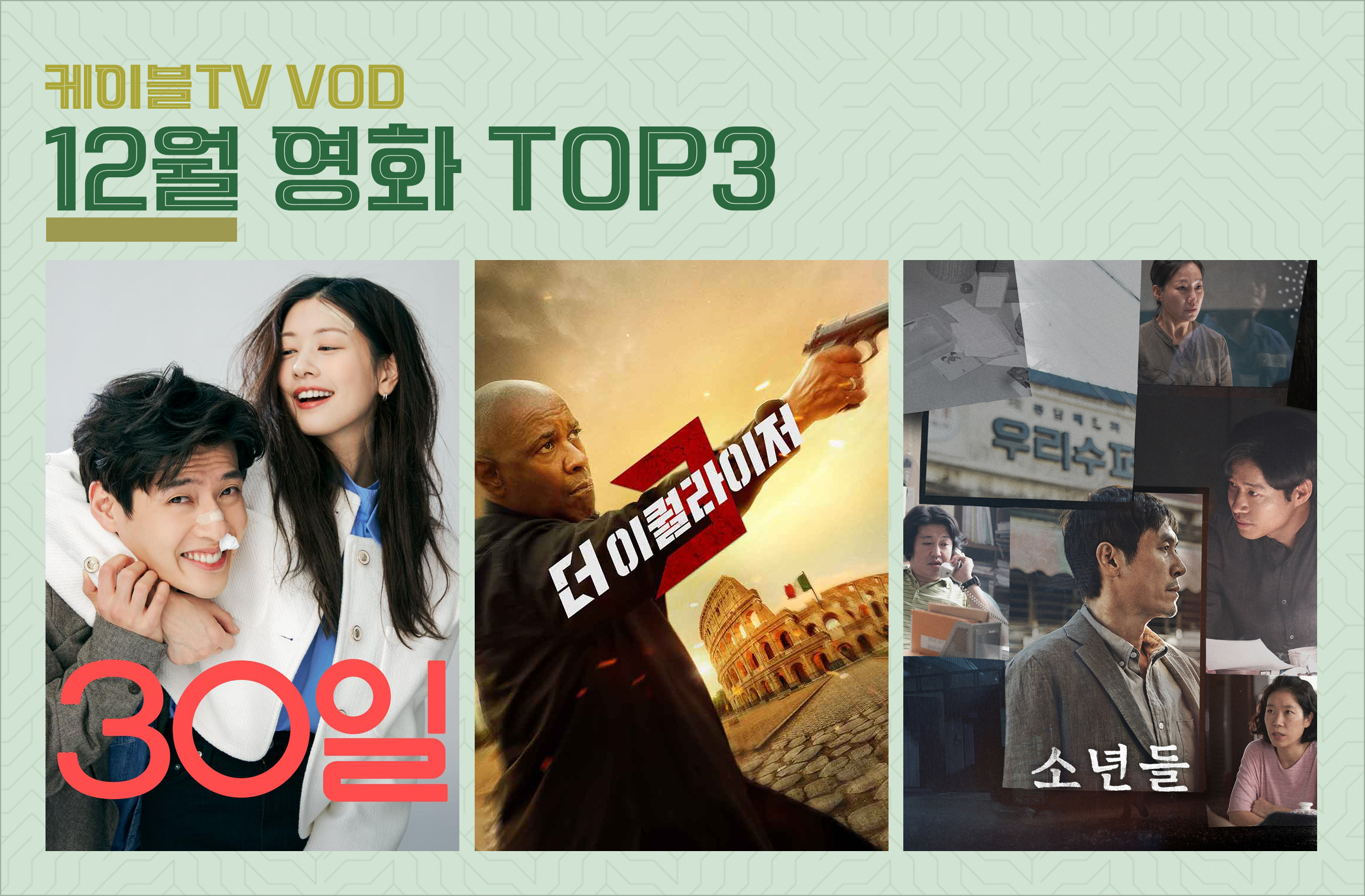 12월 영화 VOD TOP3을 차지한 ‘30’, ‘더 이퀄라이저 3’, ‘소년들은 LG헬로비전, SKB알뜰딜라이브, HCN, CMB 등 전국 케이블TV에서 VOD로 만나볼 수 있다.  <>