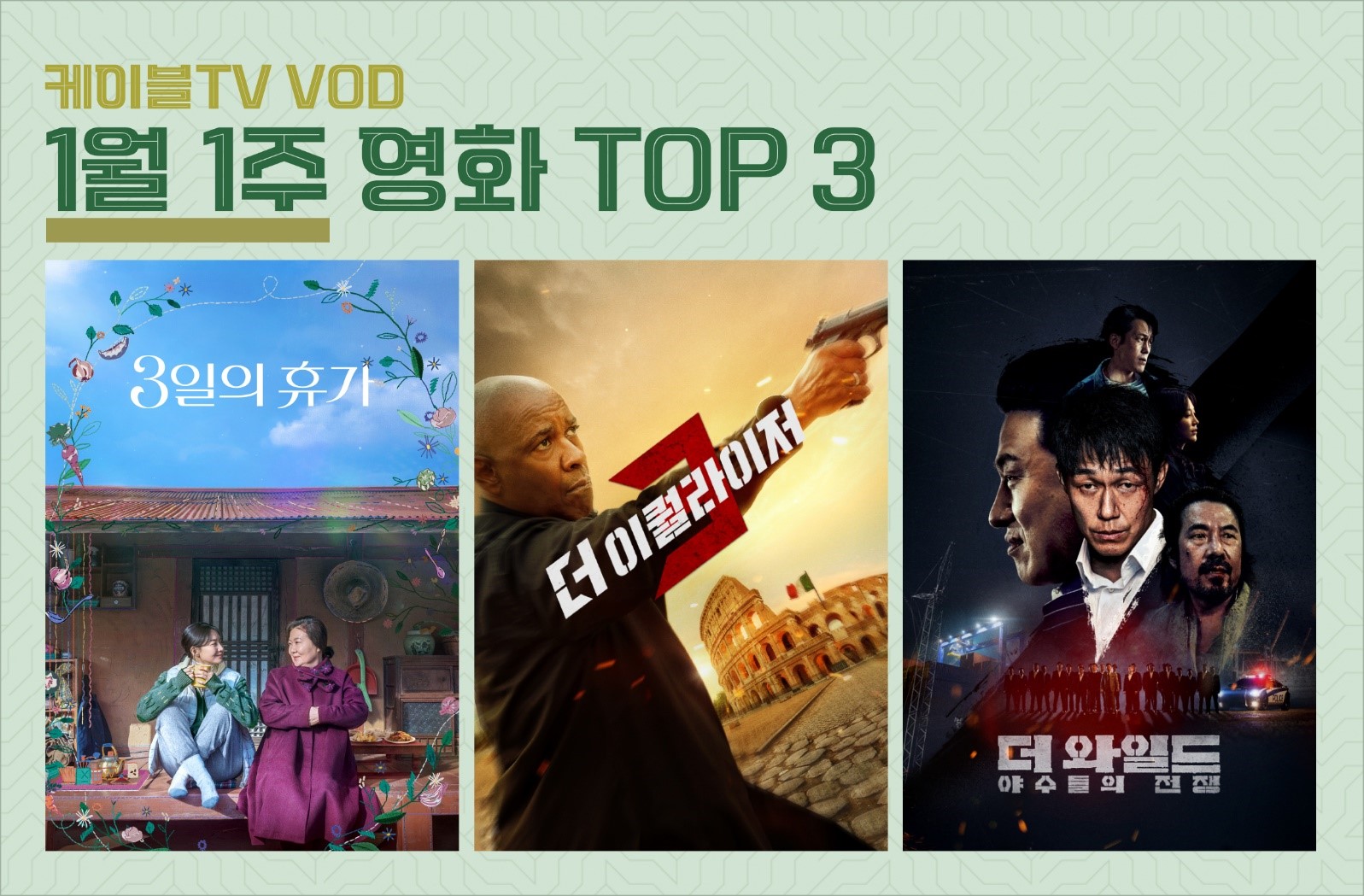 1 1주 영화 VOD TOP3를 차지한 ‘3일의 휴가’, ‘더 이퀄라이저 3, ‘더 와일드: 야수들의 전쟁’은 LG헬로비전, SKB알뜰, 딜라이브, HCN, CMB 등 전국 케이블TV에서 VOD로 만나볼 수 있다.  <>