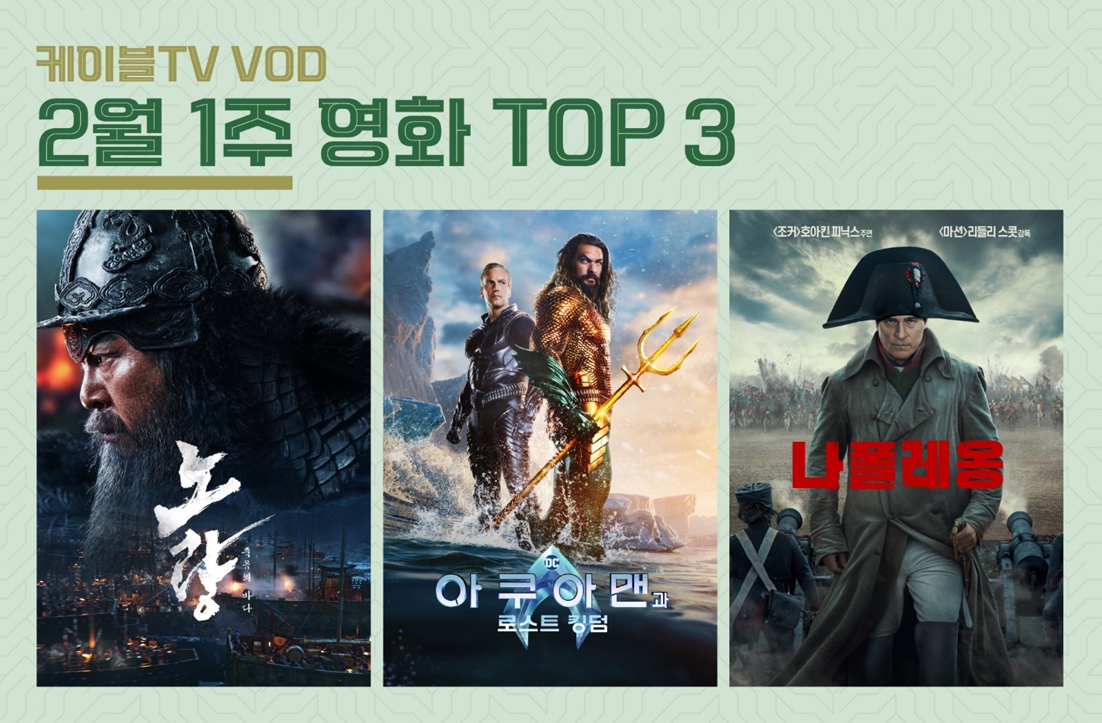 ㈜홈초이스가 오늘(2월6일) 케이블TV VOD 2월1주차 영화 TOP3를 공개했다. TOP3에 오른 영화는 ‘노량: 죽음의 바다’, 아쿠아맨과 로스트 킹덤’, ‘나폴레옹’이다.