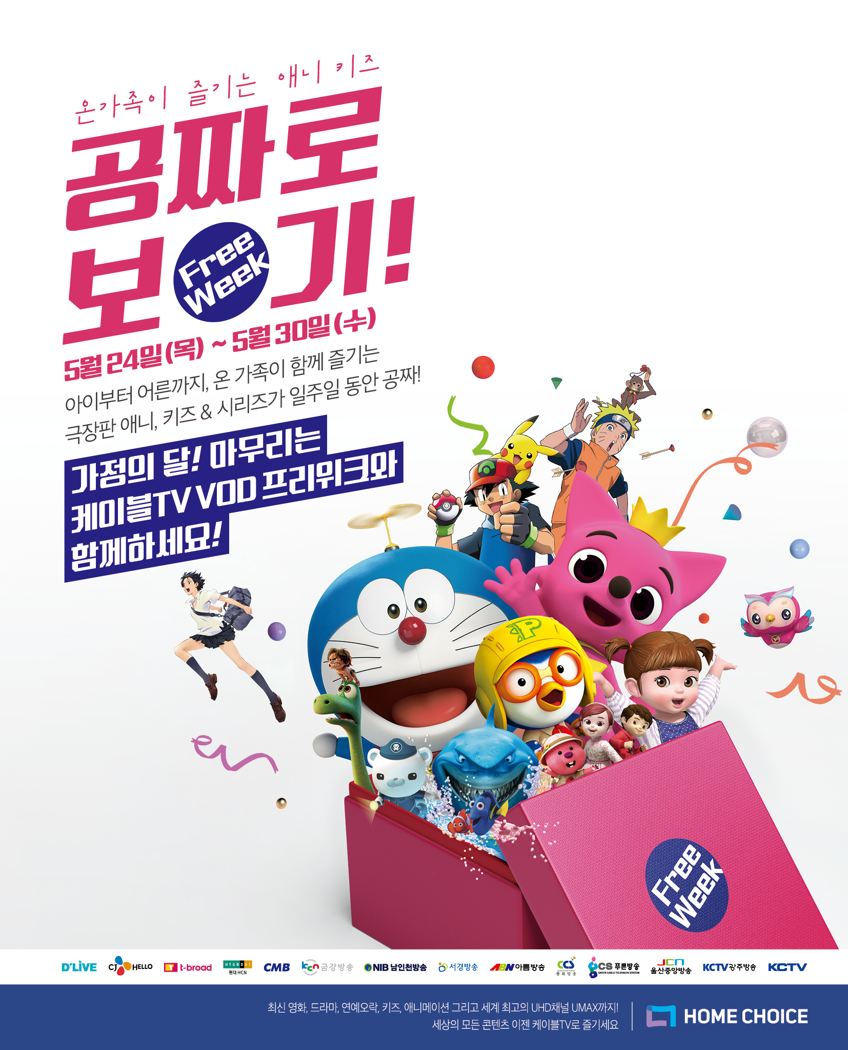 2018 523일 – 홈초이스가 CJ헬로, 딜라이브, 티브로드, 현대HCN 등 디지털케이블TV 가입자 750만명을 대상으로 오는 24일부터 30일까지 한 주간 제 4차 프리위크 온가족 애니 키즈 공짜로 보기이벤트를 진행한다.
