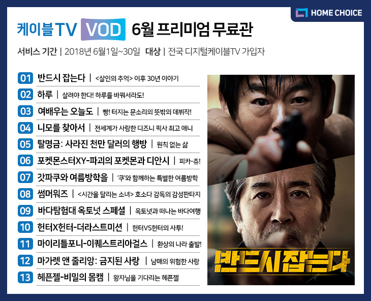 2018530일 – 홈초이스의 VOD 사업 브랜드 케이블TV VOD’<반드시 잡는다> 13편의 VOD‘6월 프리미엄 무료관을 통해 무료로 제공한다. 프리미엄 무료관은 CJ헬로, 딜라이브, 티브로드, 현대HCN 등 디지털케이블TV 가입자 750만명을 대상으로 서비스된다.