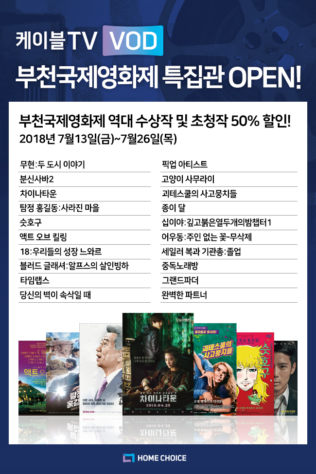 2018년 7월 12일 – 디지털케이블TV 가입자를 대상으로 ‘부천국제판타스틱영화제 특집 1,000원관’이 시작된다. 홈초이스는 CJ헬로, 딜라이브, 티브로드, 현대HCN 등 케이블TV 14개사가 공동 출자한 VOD 사업 브랜드 ‘케이블TV VOD’를 통해 역대 ‘부천국제판타스틱영화제’ 작품 VOD 를 50% 할인된 가격에 제공한다고 밝혔다.