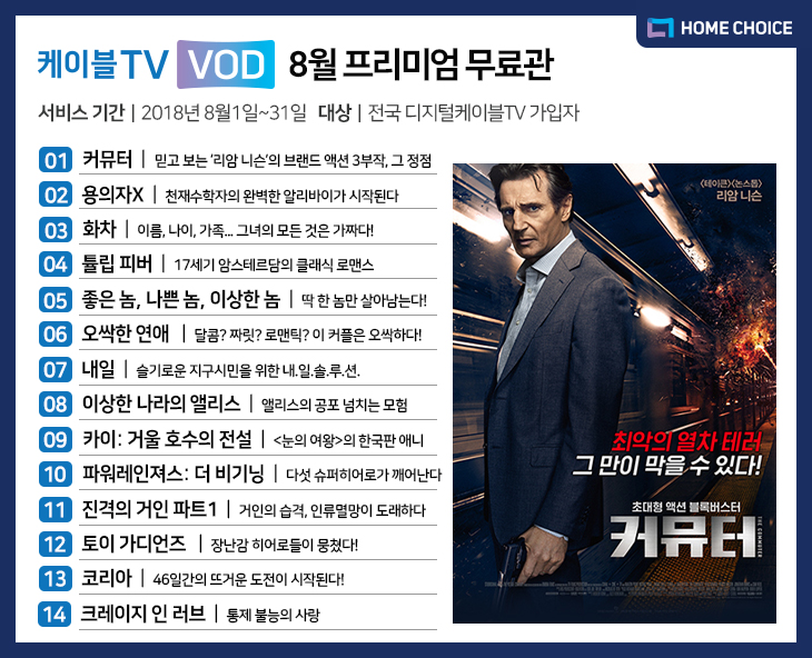 2018 7 27일 – 홈초이스의 VOD 사업 브랜드 ‘케이블TV VOD’가 <커뮤터 14편의 VOD를 ‘8월 프리미엄 무료관’을 통해 무료로 제공한다프리미엄 무료관은 CJ헬로딜라이브티브로드현대HCN 등 디지털케이블TV 가입자 750만명을 대상으로 서비스된다.
