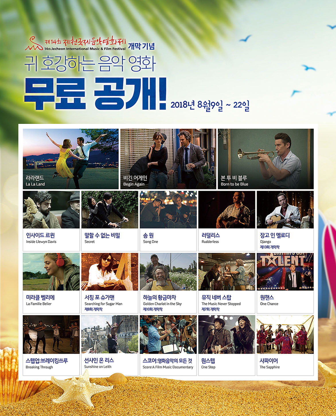 특집관은 국내외에서 호평을 받은 수작들로 구성됐다. LA를 배경으로 꿈꾸는 이들의 열정을 감미로운 재즈 선율과 함께 그려낸 <라라랜드> 2012년 제천국제음악영화제 개막작 <서칭 포 슈가맨> 매력적인 기타 반주와 서정적인 가사가 돋보이는 <비긴 어게인> ▲전설적 재즈 뮤지션 쳇 베이커의 삶을 조명한 <본 투 비 블루> <말할 수 없는 비밀>, <장고 인 멜로디> 등 총 18편이 포함됐다.