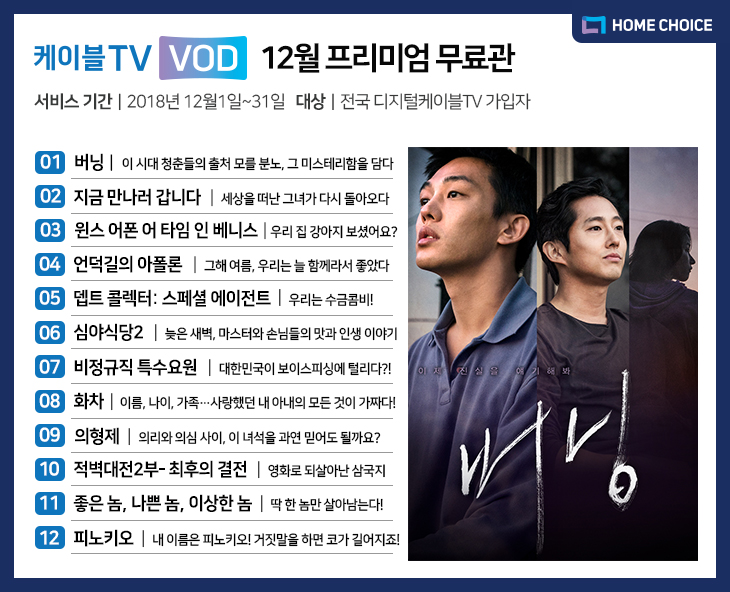 20181128일 – 홈초이스의 VOD 사업 브랜드 케이블TV VOD’<버닝> 13편의 VOD‘12월 프리미엄 무료관을 통해 무료로 제공한다. 프리미엄 무료관은 CJ헬로, 딜라이브, 티브로드, 현대HCN 등 디지털케이블TV 가입자 750만명을 대상으로 서비스된다.