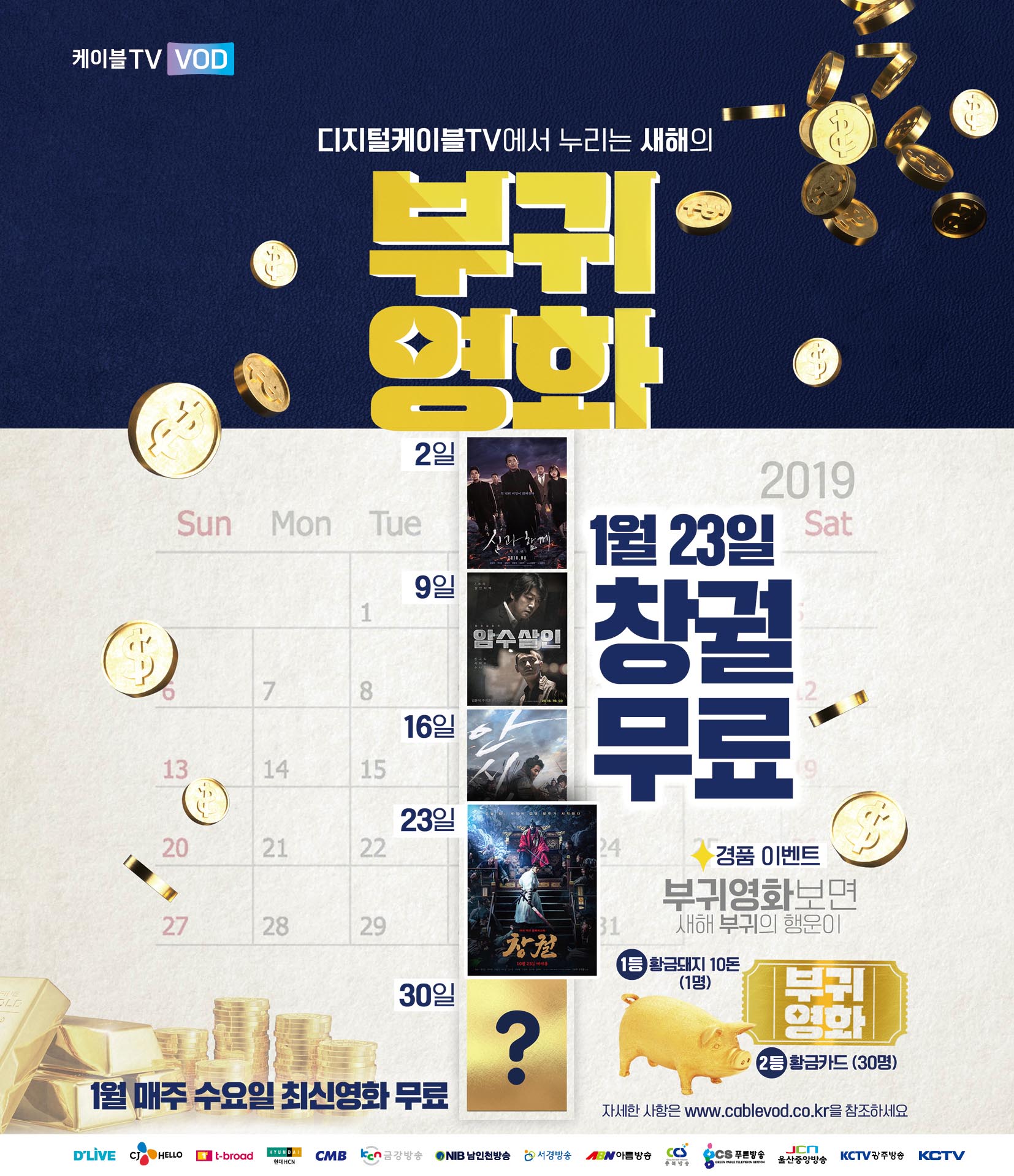 부귀영화이벤트는 1월 한달 간 매주 수요일마다 최신 영화 VOD 1편을 제공하는 케이블TV VOD의 정기 프로모션으로, 매주 강력한 무료 혜택을 제공해 디지털케이블TV 고객들에게 뜨거운 호응을 얻고 있다.