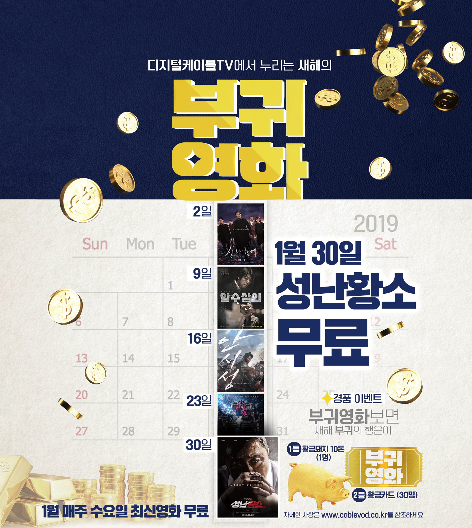 ‘부귀영화’는 새해를 맞이해 진행되는 케이블TV VOD의 대규모 정기 프로모션으로, 1월 한 달간 매주 수요일마다 신작 VOD 한 편을 무료로 제공한다. <신과함께-인과 연>, <암수살인>, <안시성>, <창궐> 등 매주 작품성 및 화제성이 높은 최신 영화를 무료로 서비스해 시청자들의 관심을 이끌고 있다.