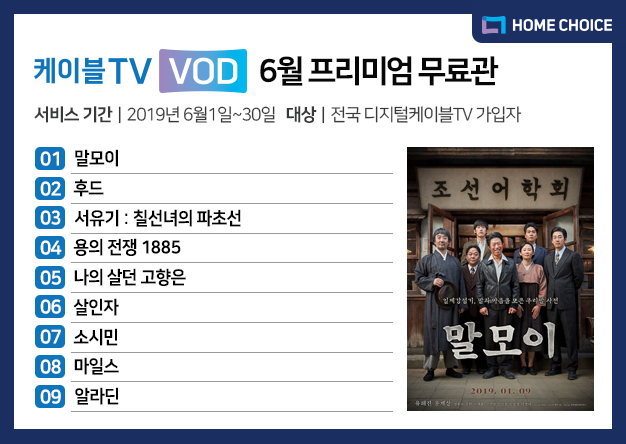 2019528일 – 디지털케이블TV에서 말모이 10편의 VOD‘6월 프리미엄 무료관을 통해 무료로 제공한다. 프리미엄 무료관은 CJ헬로, 딜라이브, 티브로드, 현대HCN 등 디지털케이블TV 가입자 750만명을 대상으로 서비스된다.