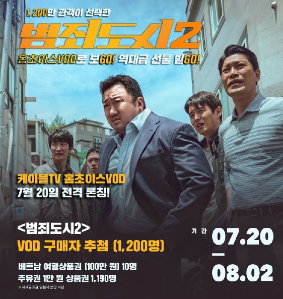 19일 ㈜홈초이스(총괄 전윤수)는 오는 20일부터 범죄도시 2’에 대한 홈초이스 VOD(케이블TV VOD) 서비스를 개시한다고 밝혔다.