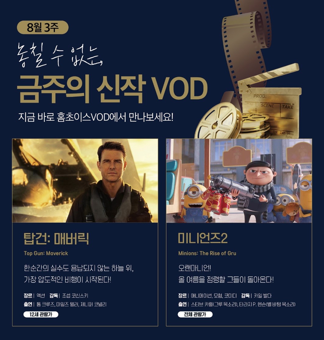 18일 ㈜홈초이스(총괄 전윤수)는 두터운 마니아층을 보유하고 있는 영화 ‘탑건: 매버릭’과 ‘미니언즈 2’의 VOD 서비스를 지난 17일부터 시작했다고 밝혔다.