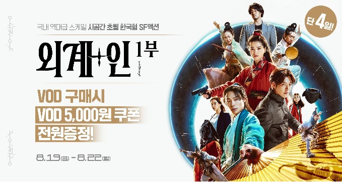 19일 ㈜홈초이스(총괄 전윤수)는 ‘외계+ 1부’ VOD의 서비스에 앞서 사전구매 이벤트를 이날부터 나흘 동안 실시한다고 밝혔다. 기간 내 ‘외계+ 1부’ VOD를 사전구매한 전원에게 VOD 쿠폰(5,000)이 증정된다.